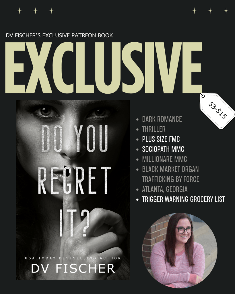 Subscriptions are now live for DV Fischer. If you want to read Do You Regret It, receive art, letters from characters, discounts on merch, holiday scenes from favorite books, and so much more, make sure you subscribe to a tier.